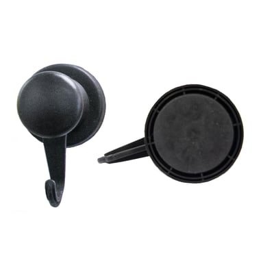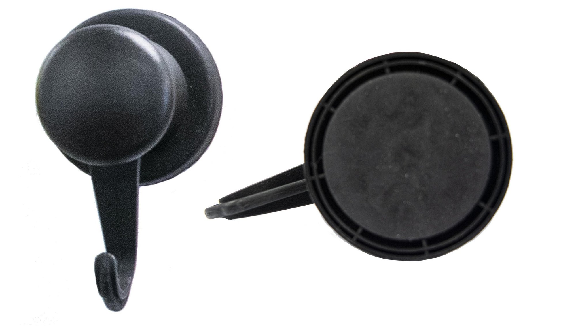 Sort pottemagnet med drejelig krog fra Eclipse. Den drejer frit 360° og har en gummibase, der reducerer risikoen for ridser og øger friktionen. Ideel til ophængning.