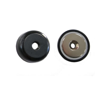 Sort neodymium pottemagnet fra Eclipse med forsænket hul til skruehoved. Ø40x8mm, hulstørrelse Ø6,5 mm. Passer til M6 skrue. Trækkraft 52 kg. Pakke med 5 stk.