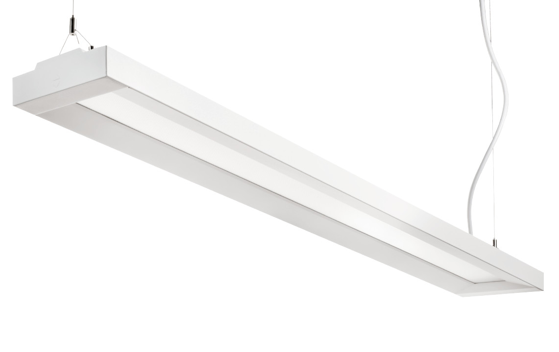 Slankt og stilfuldt nedhængt armatur med direkte og indirekte lys. Ideelt til kontorer, skoler og offentlige bygninger. Nem installation og lav blænding (UGR<19).