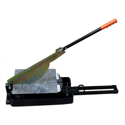 Slagsaksen kan foldes sammen, hvilket gør den nem at transportere og opbevare. Den leveres inklusive en bakke til opsamling af restmateriale samt en støttefod, der sikrer stabilitet under brug.