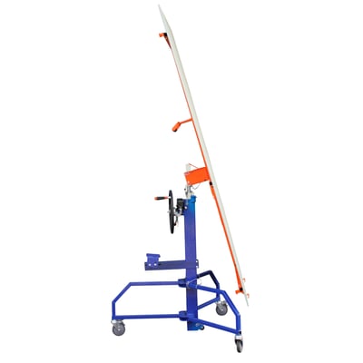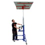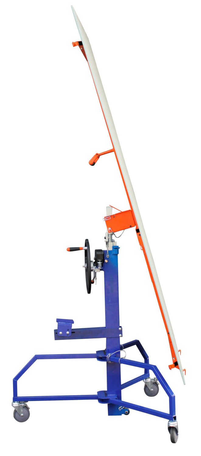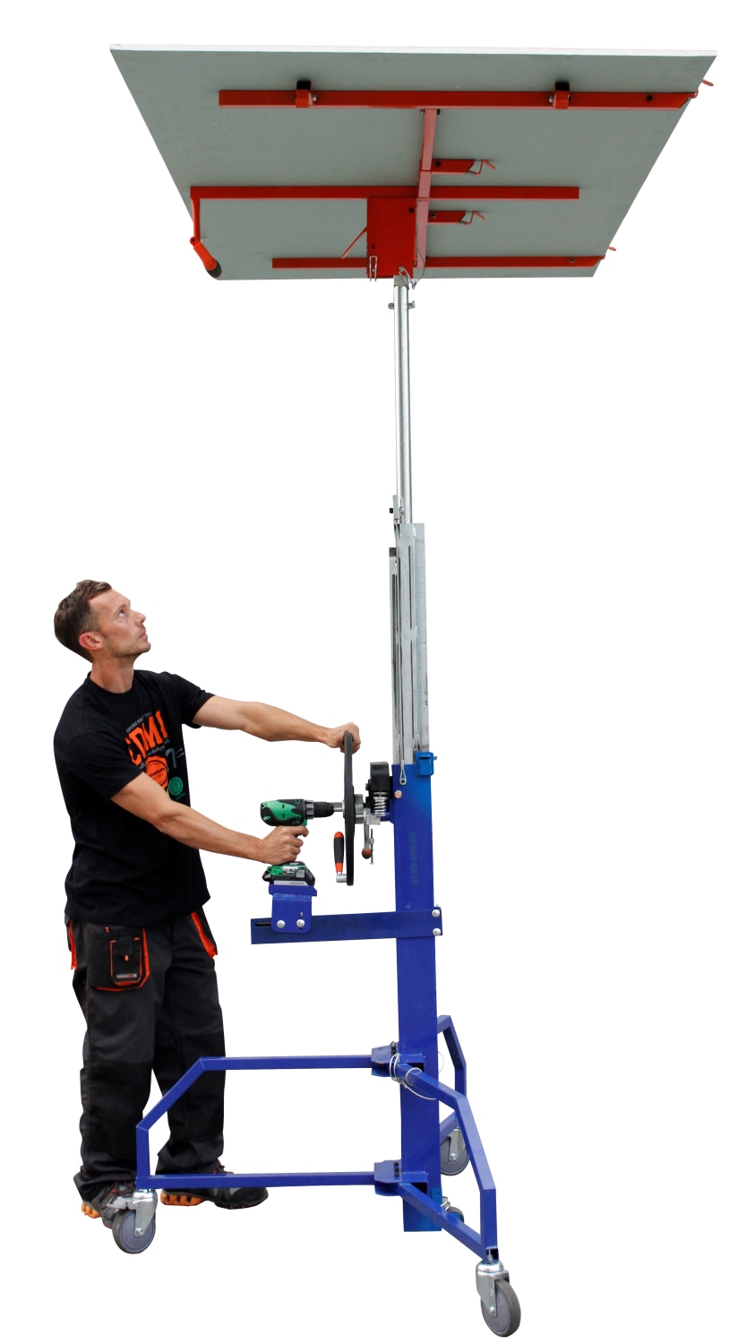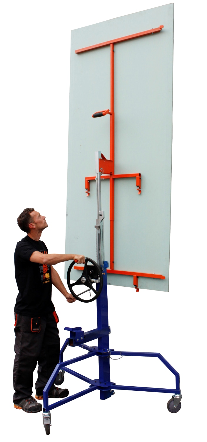 Edmaplac pladeløfter til lodret, vandret og vægmontering samt til skråvægge og -lofter. Hæves/sænkes via håndhjul eller skruemaskine. Løftehøjde: 4,5 m m. forlænger.