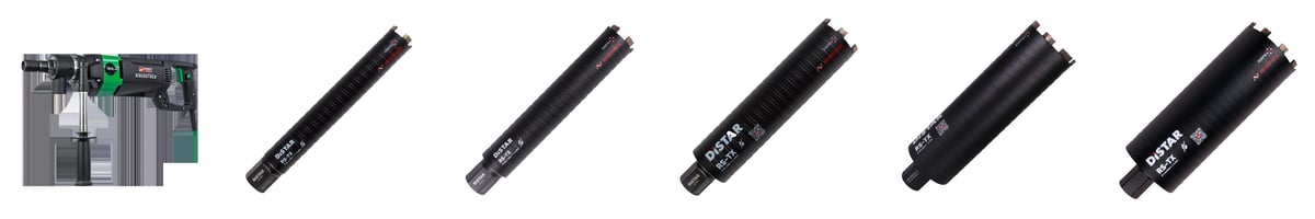 Distar diamantkernebor Ø52, Ø62, Ø82, Ø102 og Ø112 mm, til tørboring i beton med Soft Slag. Tørboring med impulsslag og opnå præcise og effektive borehuller i armeret beton og andre byggematerialer.