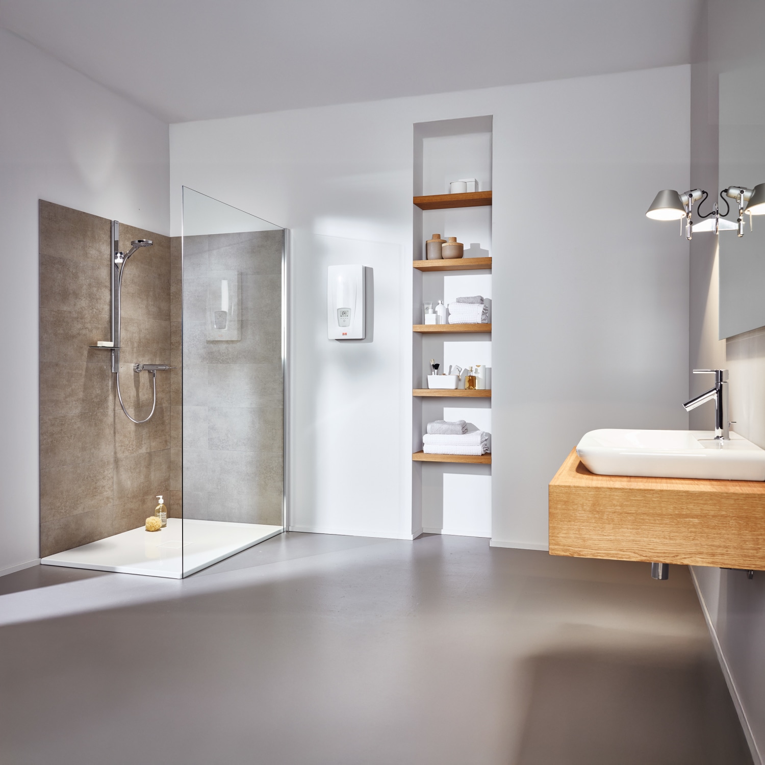 Væghængt gennemstrømningsvandvarmer, der kan levere varmt vand til flere tappesteder samtidigt, som f.eks. bad, bruser, køkken og håndvask.