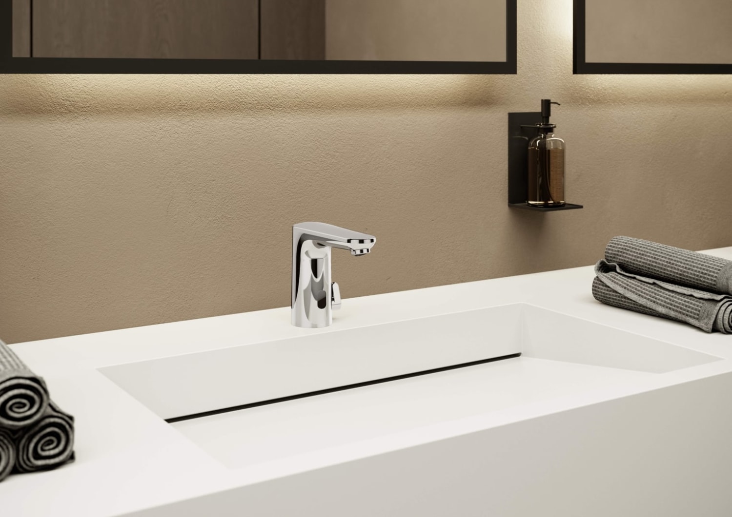 Berøringsfrit håndvaskarmatur med moderne design, Bluetooth-styring og avanceret sensorteknologi. Inkl. Power Unit for selvdrevet strømforsyning.