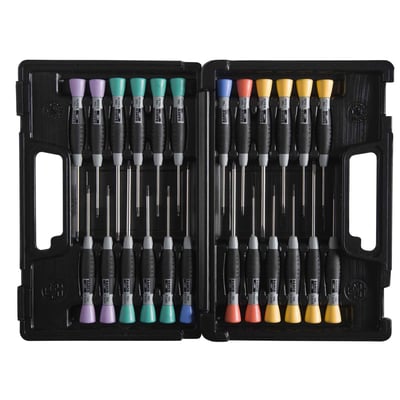 Dette elektronik skruetrækkersæt fra Bahco's 700-serie indeholder 24 dele og er designet til præcisionsarbejde. Skruetrækkerne er udstyret med et roterende hoved for hurtig betjening med fingrene og et komfortabelt greb.