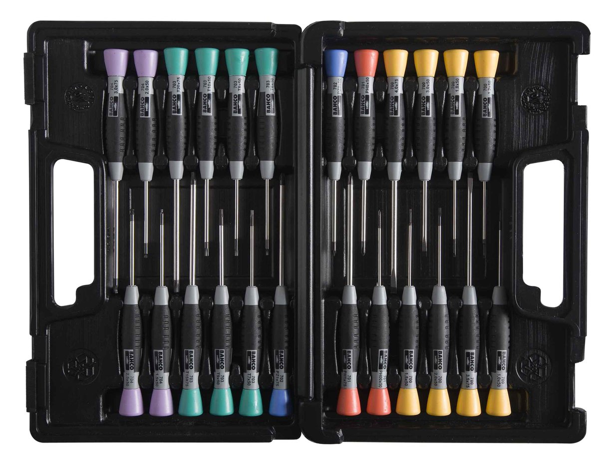 Bahco elektronik skruetrækkersæt med 24 dele fra 700-serien. Med roterende hoved, komfortabelt greb og farvekodet indikation af kærvtypen.