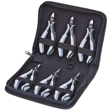 Knipex elektroniktang-etui med 6 præcisions-elektroniktænger i ESD-udførelse. Mål, lukket: 215 x 160 x 50 mm. Etui i slidstærkt polyesterstof.