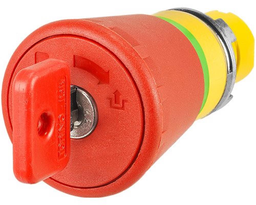 Elfin PTHCSRK nødstopshoved med paddetryk. Betjening: Tryk - Drej med nøgle. Diameter: 50mm. Farve: Rød.