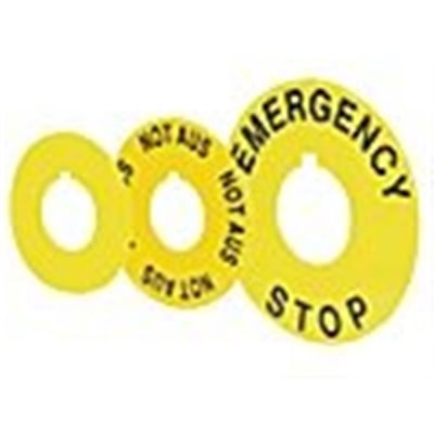 Nødstopsskilt til trykknapper med engelsk tekst. Diameter: 60mm. Farve: Gul.