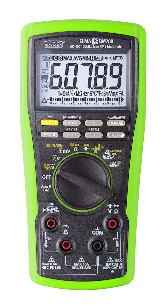 Elma BM789 har belyst display med analog bargraph for nem og hurtig aflæsning. Instrumentet er forsynet med automatisk/manuelt områdevalg, relativmåling, Peak hold, min/max, datahold samt intelligent auto power off.
