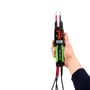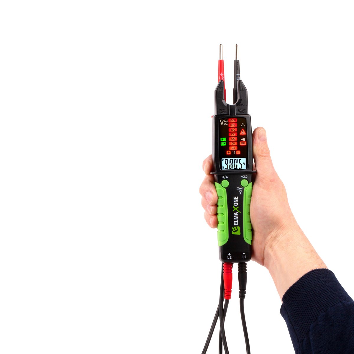 Den opfylder desuden spændingstesterdirektivet for kontrol af spændingsløs tilstand og har meget kraftige udskiftelige ledninger med 4 mm standard bananstik samt udskiftelige prøvespidser 2/4 mm og indbygget kraftig lommelygte.