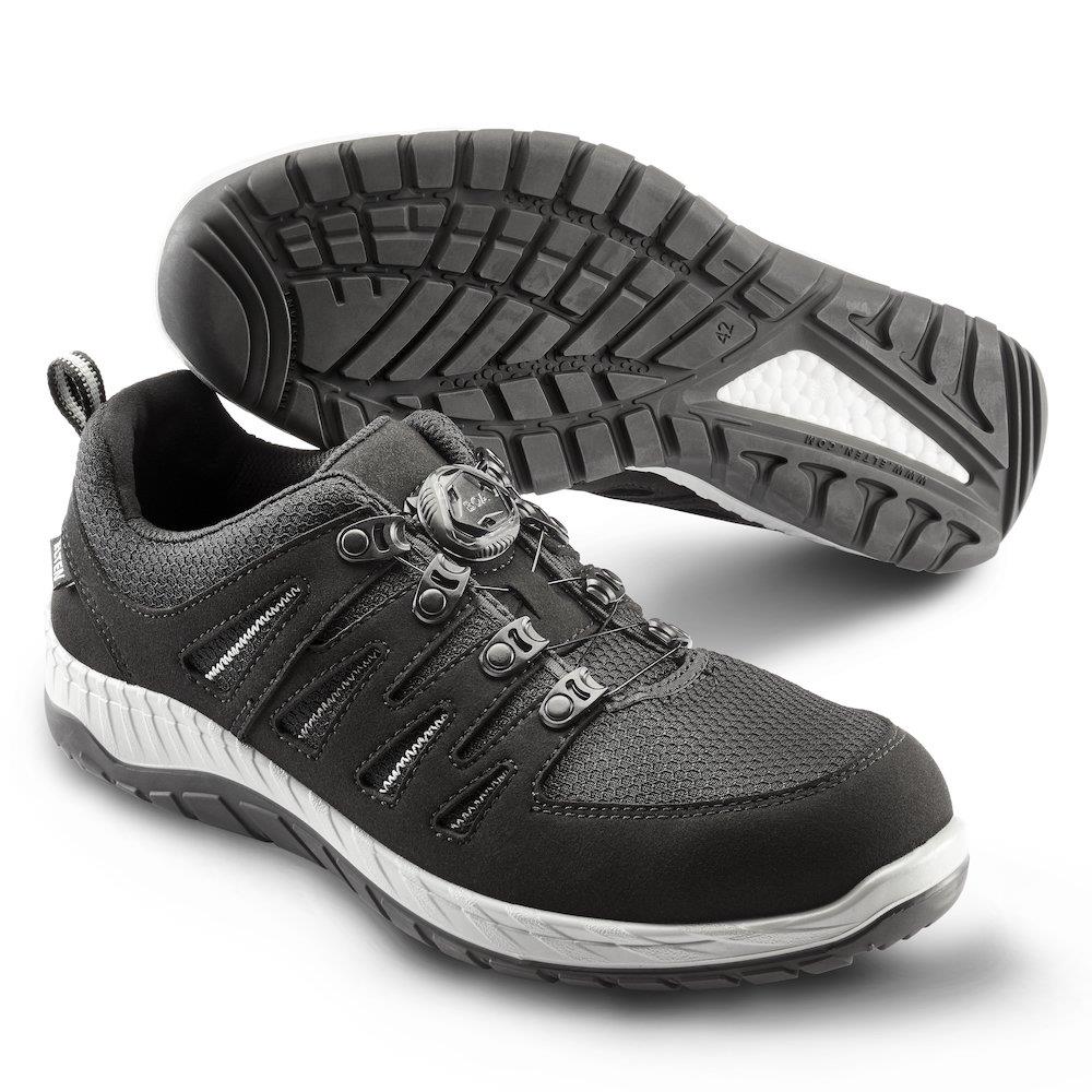 Disse lette og sporty sikkerhedssko er designet til maksimal komfort og beskyttelse. Overdelen er fremstillet af slidstærkt, åndbart og vandafvisende microfiber/tekstil, hvilket sikrer tørre og behagelige fødder hele dagen. Det innovative BOA Fit System giver en hurtig, nem og præcis justering af pasformen.