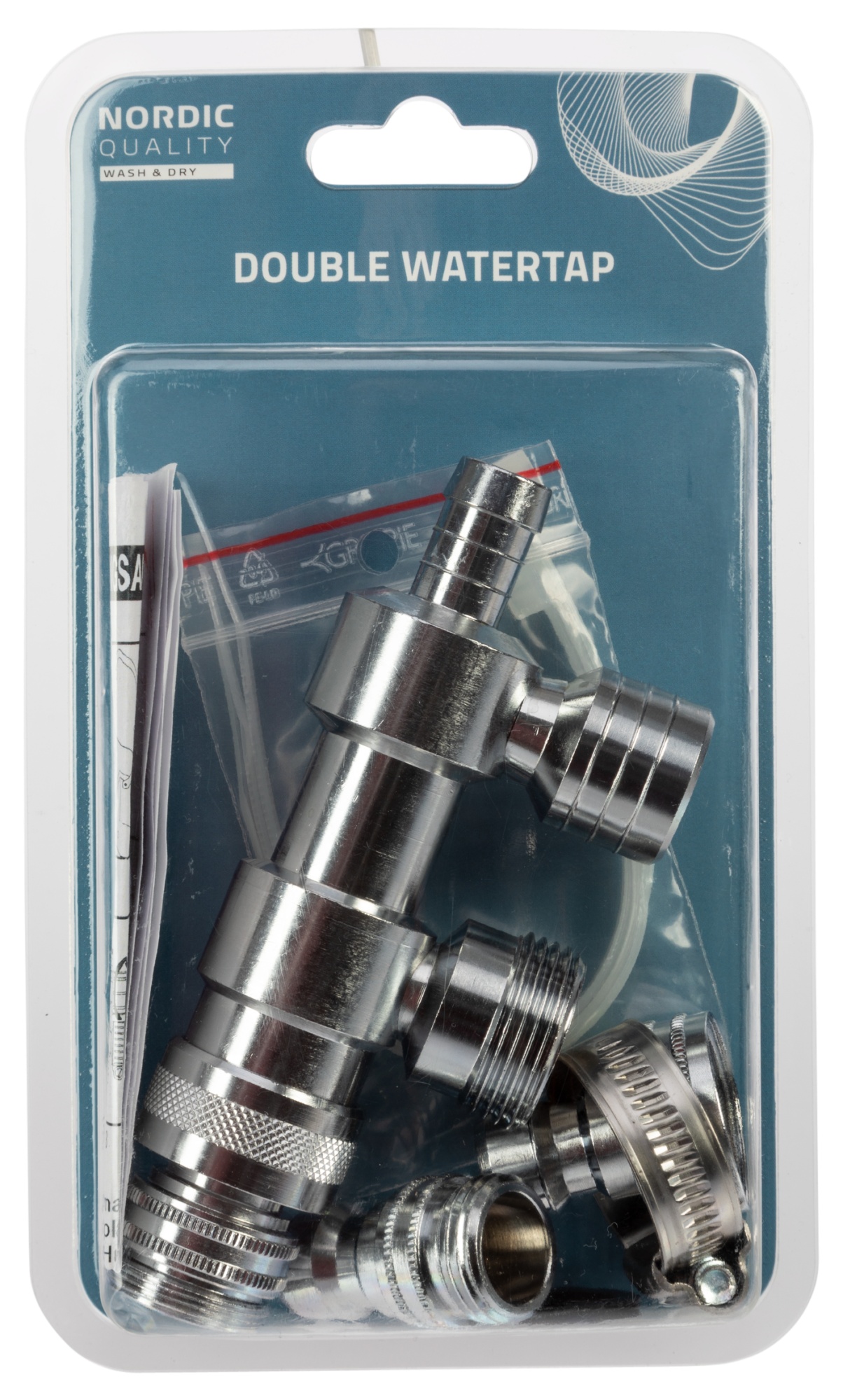 Dobbelt vandkobling med fittings inkluderet. Denne kobling er ideel til installationer, hvor der kræves en sikker og pålidelig forbindelse.