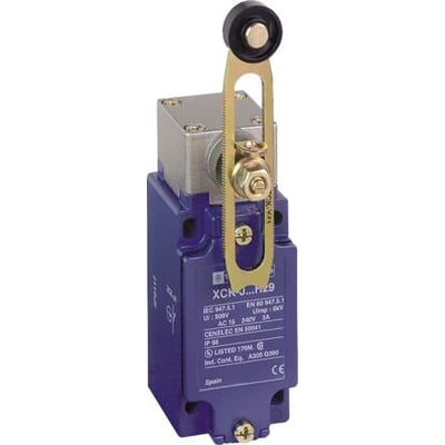 Endestop XCKJ industriel i metal med roterbar arm i variabel længde med plastrulle. 1NO+1NC snap action kontaktsæt. 1/2" NPT gevind indgang.