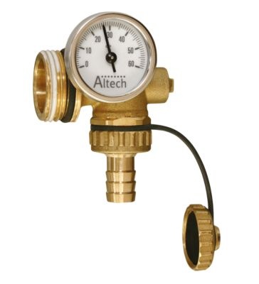 Endestykke til gulvvarme fordelerrør med påfyldning/aftap, udluftning og termometer.