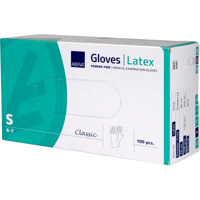 Abena Classic undersøgelseshandske i latexgummi. Pudderfri, usterile, naturfarvet, glat overflade, med rullekant. Tykkelse: 0,11 mm. Godkendt til håndtering af fødevarer. EN455.
