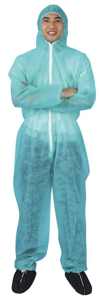 Engangsheldragt med hætte, lynlås og elastik ved ankler og håndled. Fremstillet i PP non woven, grøn, 35gsm, størrelse L. Indeholder 50 stk.