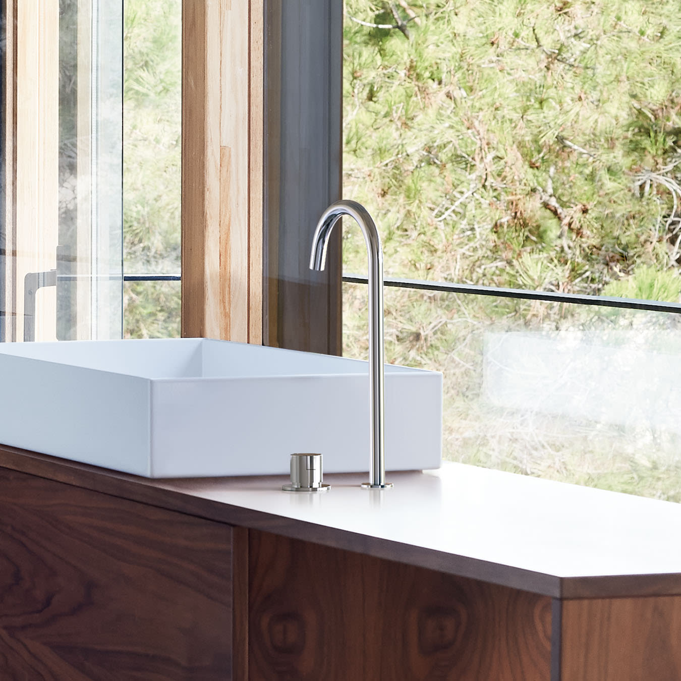 Elegant 1-grebsblander i messing med svingbar tud og vandbesparende funktion. Perfekt til bord- eller vaskmontering.