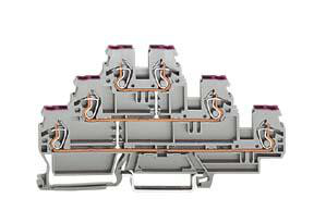 3-etageklemme med sidepåskrift, internt forbundet, 6-leder gennemgang, TS 35, front-ledningsføring og CAGE CLAMP COMPACT-tilslutning i horisontal udførelse.