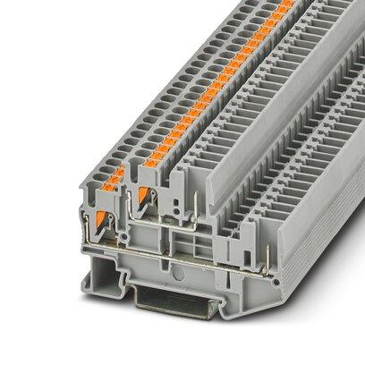 Etageklemme med push-in og stiktilslutning. Til tværsnit fra 0,14 mm2 - 4 mm2, AWG 26 - 12. Bredde: 5,2 mm, grå. Til montering på NS 35/7,5 og NS 35/15.