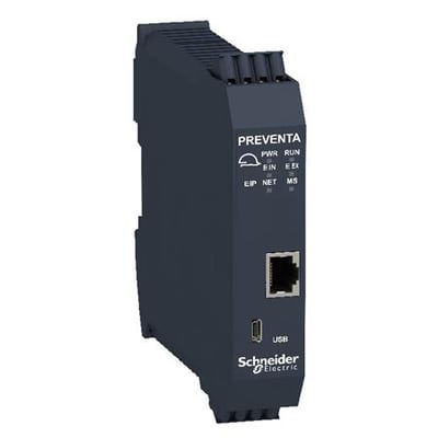 Ethernet IP kommunikationsmodul til XPSMCM sikkerhedscontrolleren. Preventa XPSMCM kan håndtere op til 128 sikkerhedsindgange og 16x2 sikkerhedsudgange.