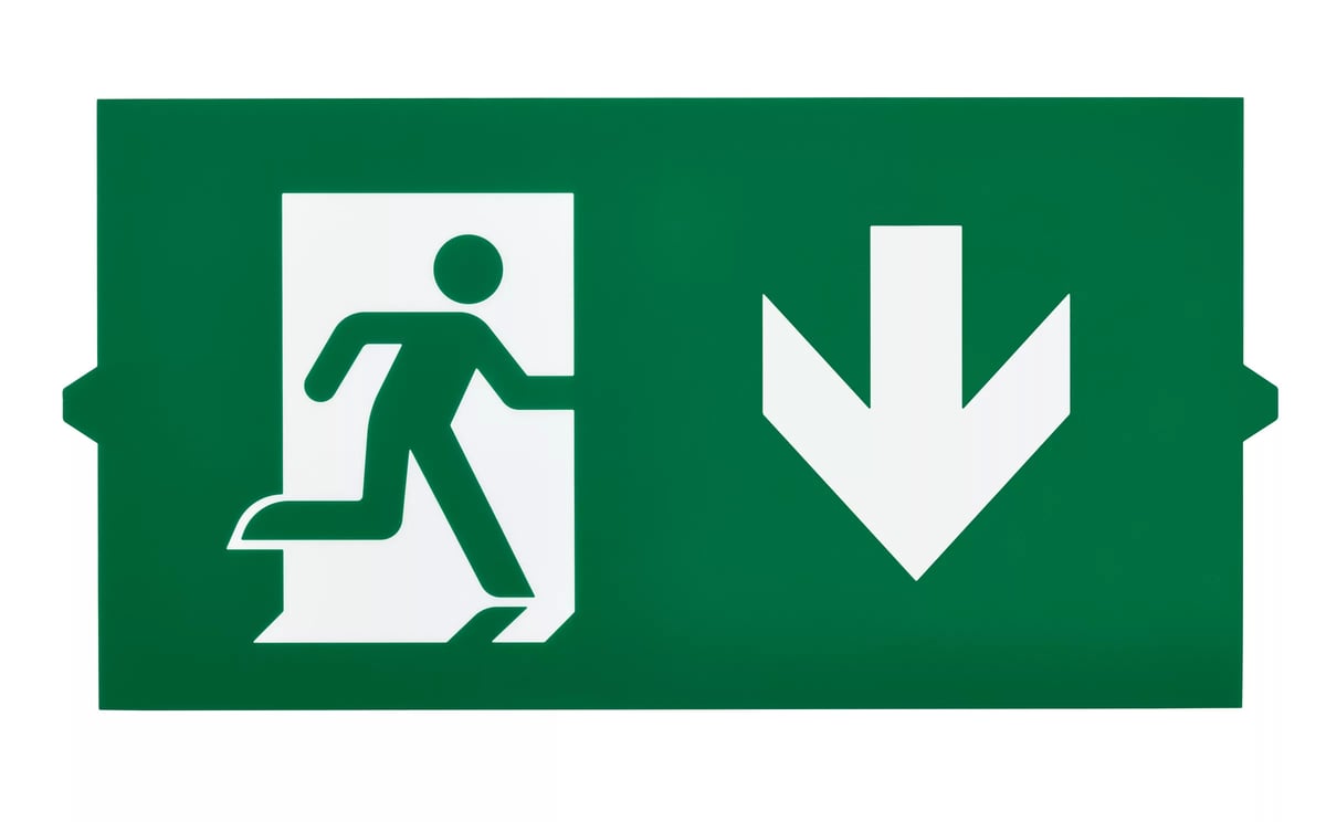 Exit skilt med ned-piktogram for sikker og forskriftsmæssig nødbelysning. Lithiumbatteri (LiFePO4) forlænger levetiden og forbedrer afladningsadfærden.