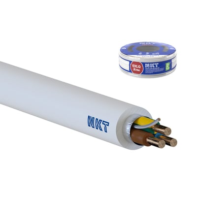 Halogenfrit installationskabel EXLQ Xtra Dca fra NKT Fasteners. 3G1,5 mm², hvid, med en maksimal driftstemperatur på 90° og CPR brandklasse Dca.