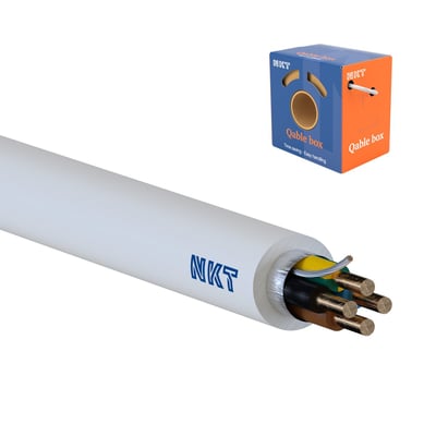 Halogenfrit installationskabel EXLQ Xtra Dca fra NKT Fasteners. 4G1,5 mm², hvid, til fast installation i rør eller kanaler, indendørs og udendørs (dog ikke i vand).