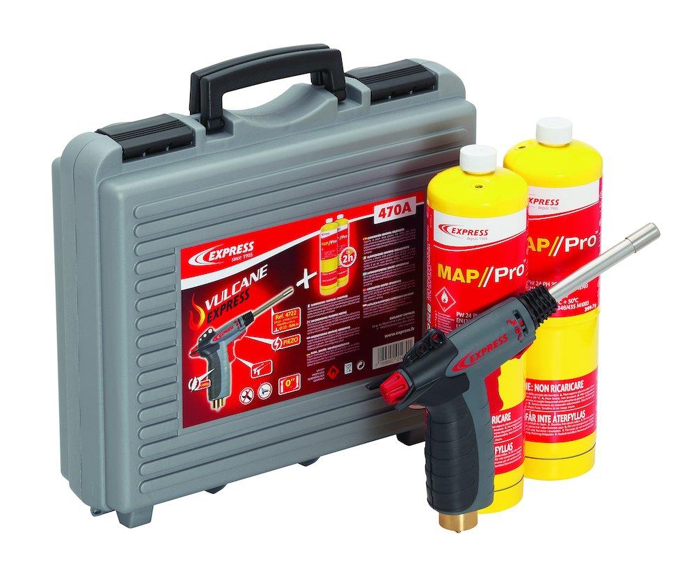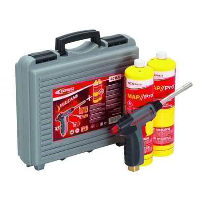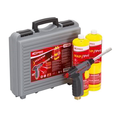 Express Vulcane 470 gasbrændersæt med piezotænding, turbobrænder (op til Ø22 mm) og 2 stk. 2400 MAP/PRO gas. Ideel til lodning, opvarmning og VVS-opgaver.