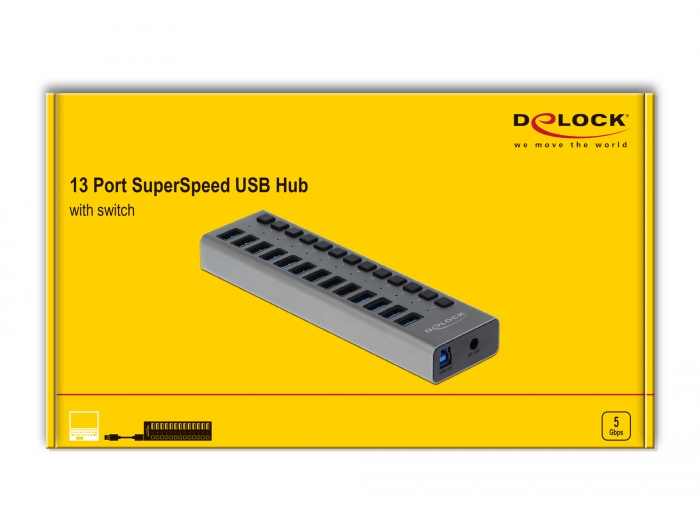 Solid USB hub fra Delock med metalhus. Tilsluttes computeren via USB Type-A og udvider med 13 USB Type-A porte. Oplad smartphones eller overfør data med 5 Gbps.