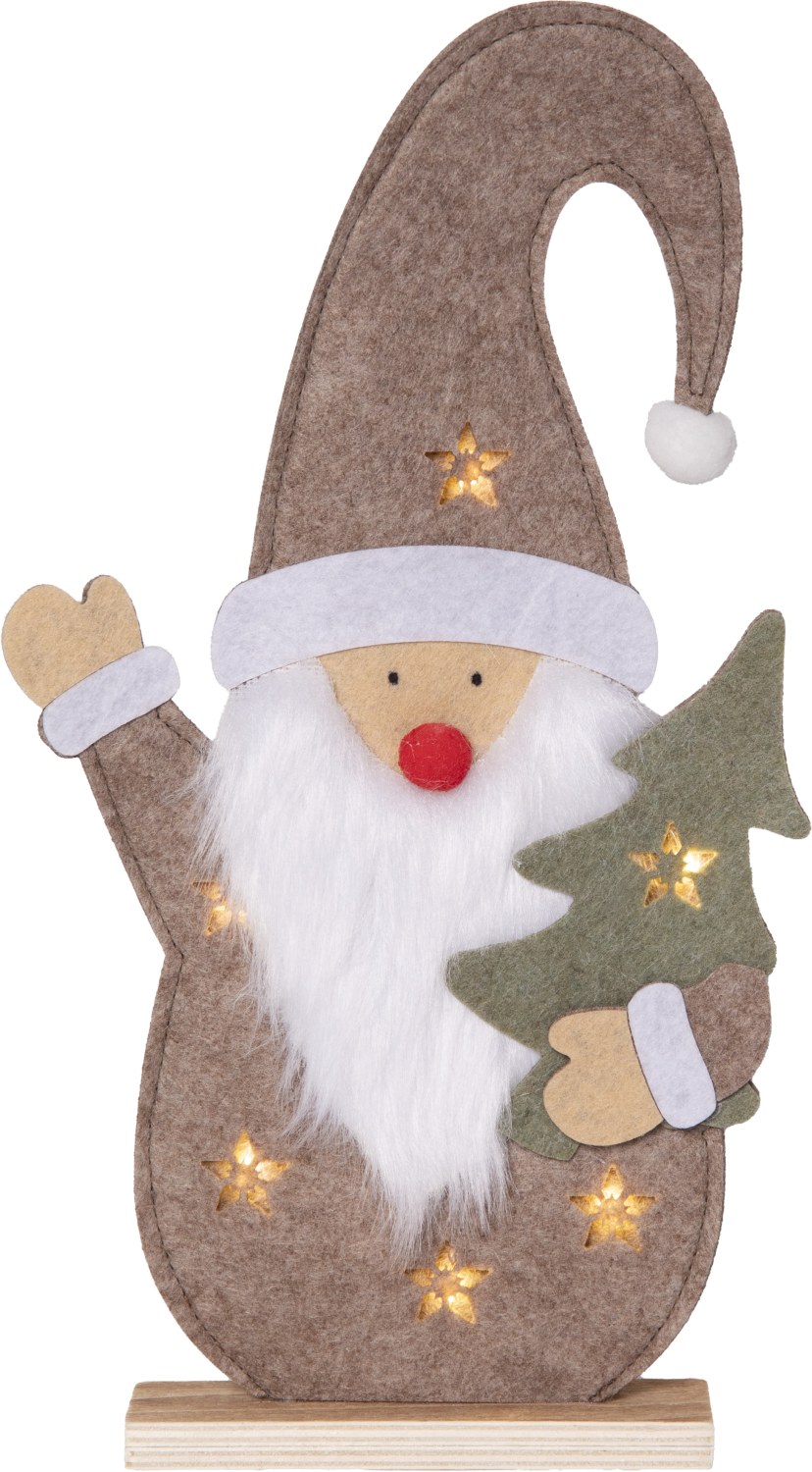 Sød Star Trading Fabbe nisse til batteridrift. 30 cm høj, 17.5 cm bred, lavet af stof. Med timerfunktion (6 tændt/18 t slukket). Kræver 2x AA batterier (medfølger ikke).