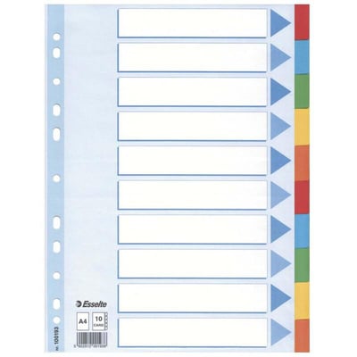 Disse Esselte faneblade er designet til at give en klar og struktureret organisering af dine dokumenter. Med et standard A4-format (210x297 mm) passer de perfekt til de fleste ringbind og mapper. Sættet indeholder assorterede farver, hvilket gør det nemt at farvekode forskellige sektioner eller emner for hurtig identifikation.