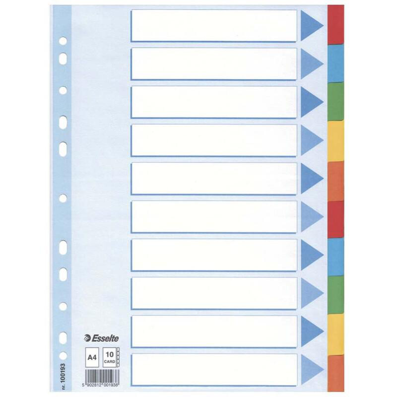 Esselte faneblade i A4-format, assorterede farver, 210x297 mm, ideelle til organisering af dokumenter.