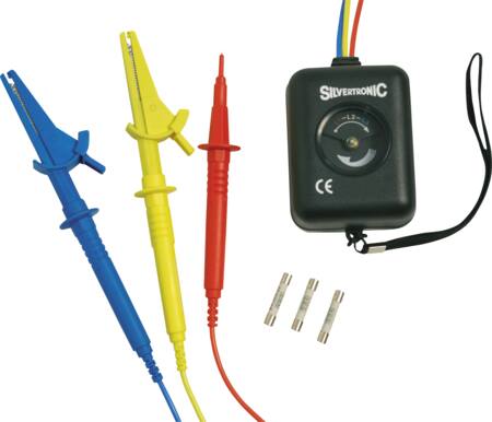 Silvertronic 135007 er en robust fasefølge-/drejefelttester med indbygget sikring i alle ledninger. Velegnet til 690V forsyning.
