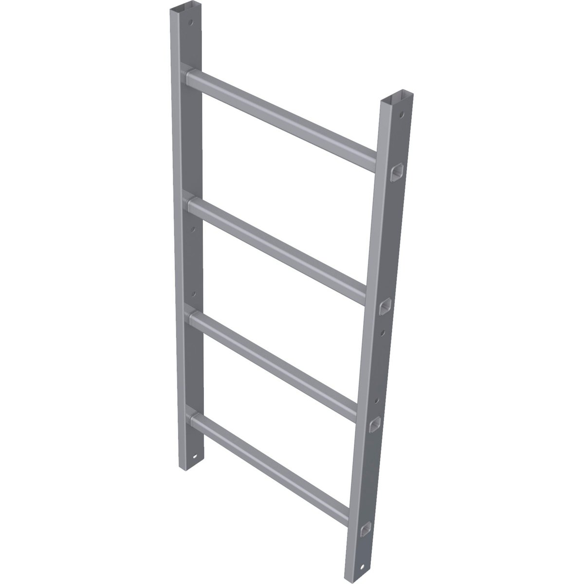 Fast stige i aluminium med 13 trin (280 mm afstand). Rillede 30x30 mm trin, 520 mm bredde. Vanger 60x25 mm. Rygbøjler kræves over 3 m.