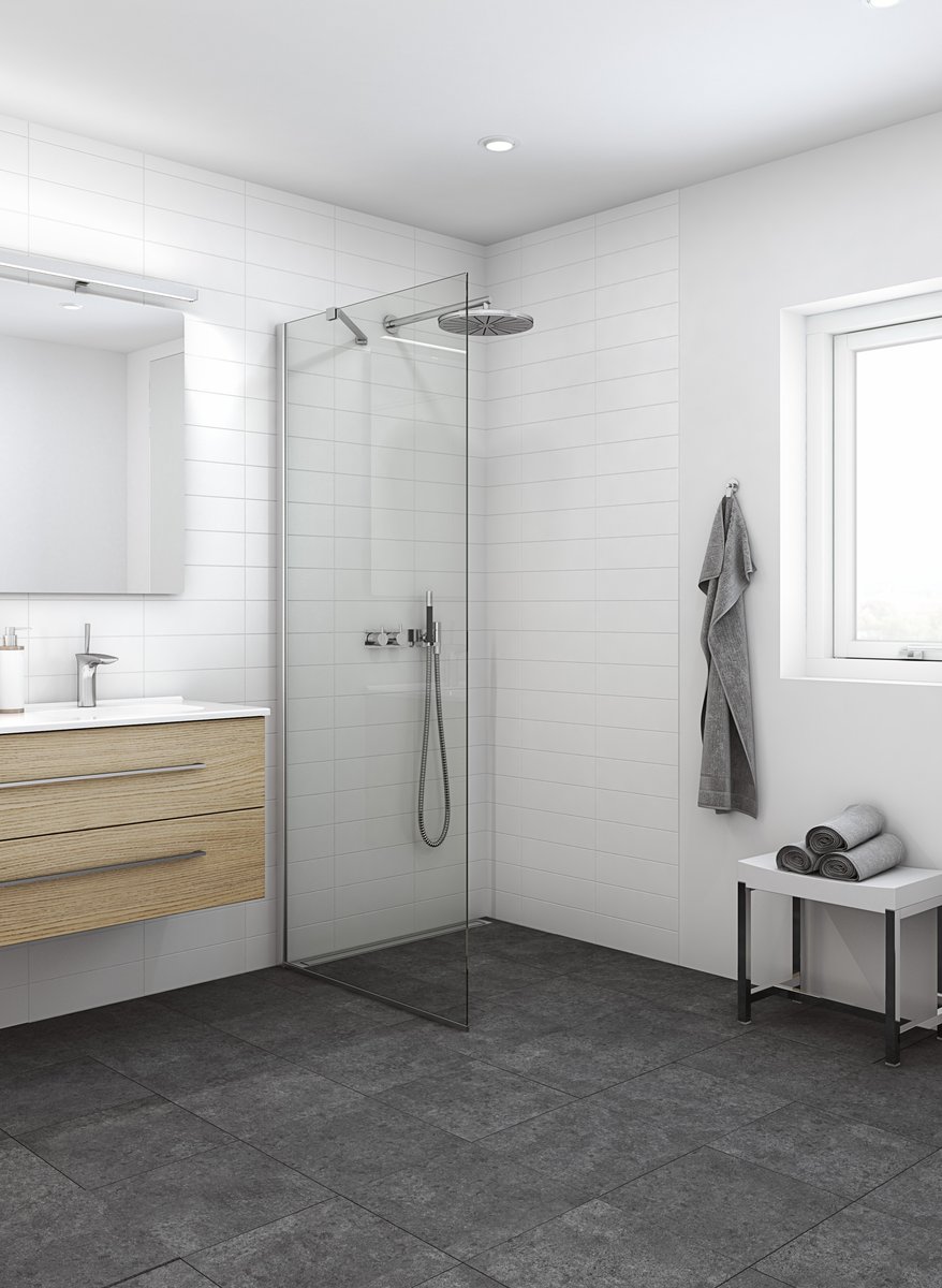 Væggen er vendbar, hvilket giver mulighed for hængsling til enten højre eller venstre. Den kan bruges enkeltvis eller kombineres med andre bruseløsninger og størrelser, så du kan skabe lige præcis den brusekabine, du ønsker.