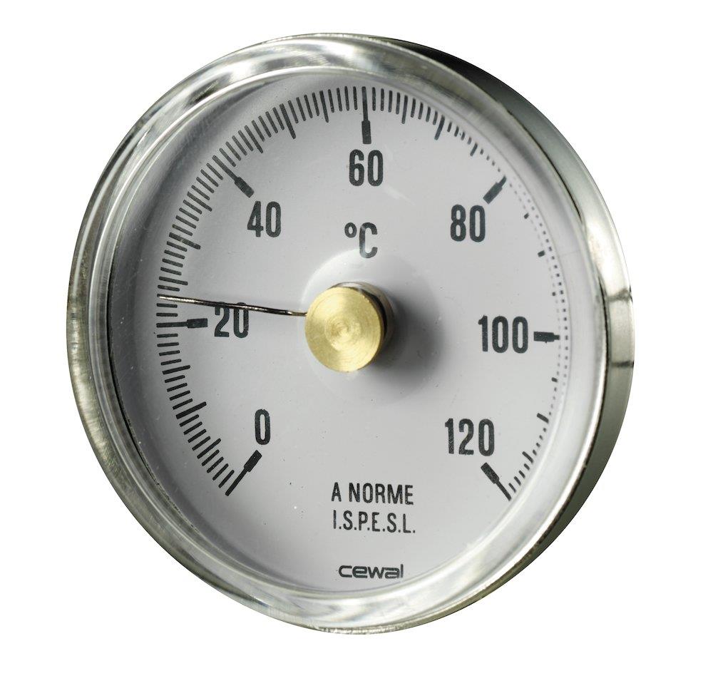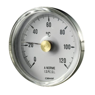 Fastspændingstermometer med bimetalspiral og fjeder af stål. Beregnet til rør med udvendig diameter 20-60 mm. Temperaturområde: 0-120°C.