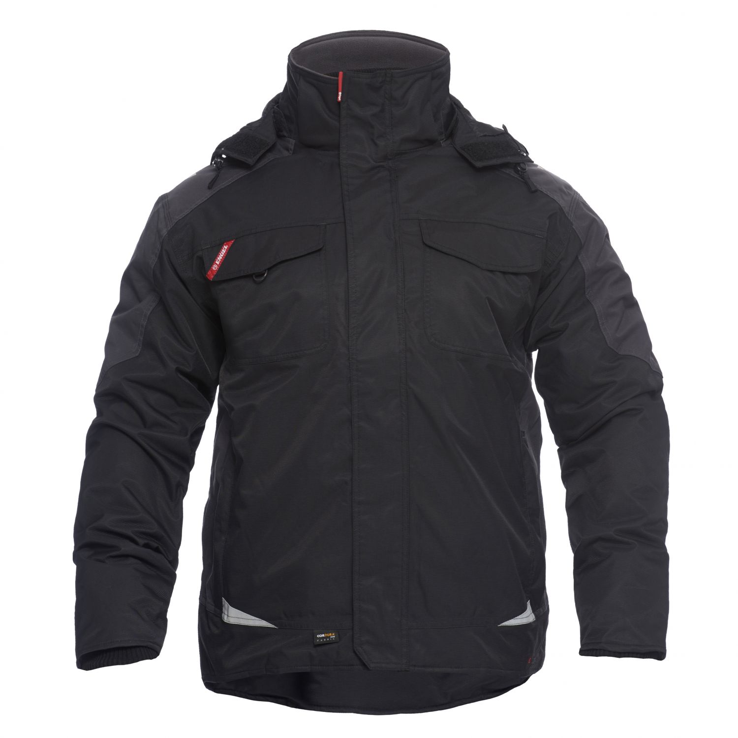 Vandtæt og åndbar pilotjakke med høj hals og forlænget bagstykke. Aftagelig hætte, skjult lynlås og Cordura-forstærkning på albuerne for øget slidstyrke.