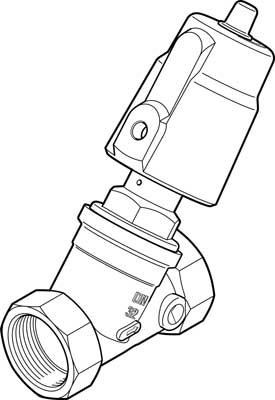 Festo skråsædeventil med ventilstruktur med fjederretur, pneumatisk aktivering og blød tætning. Kan monteres i alle positioner.