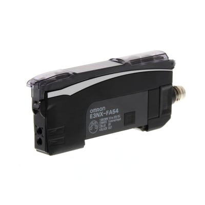 Fiberforstærker med dobbelt digitalt display, smart tuning, PNP, enkelt output, ekstern indgang og M8 stik.