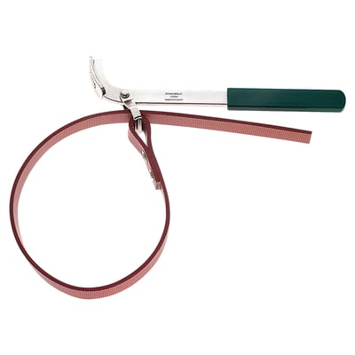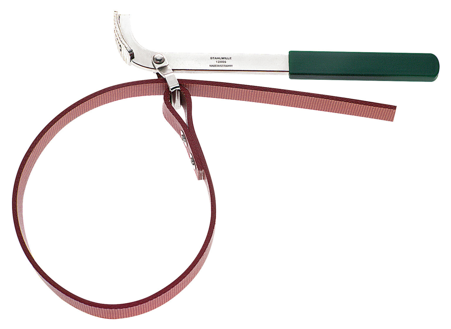 Stropnøgle 12005 fra Stahlwille til oliefilter og følsomme skruer op til 180 mm. Skridsikkert gummibelagt bånd, 22 mm bred.