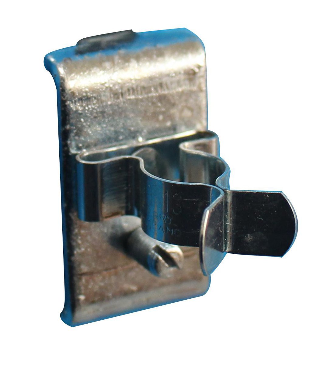 Fjederklemme med bagplade, Ø13 mm. Passer til hulplader med firkantede huller (9 x 9 mm). Centerafstand 34 mm og 38 mm.