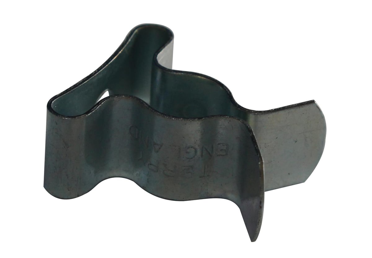 Fjederklemme uden bagplade. Denne fjederklemme er designet til brug i træplader og har en diameter på Ø6 mm.