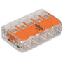 Fjedersamlemuffe 5 x 0,14-4 mm². Transparent plast med orange vipper, skrueløs og halogenfri. Blisterpakke med 8 stk.