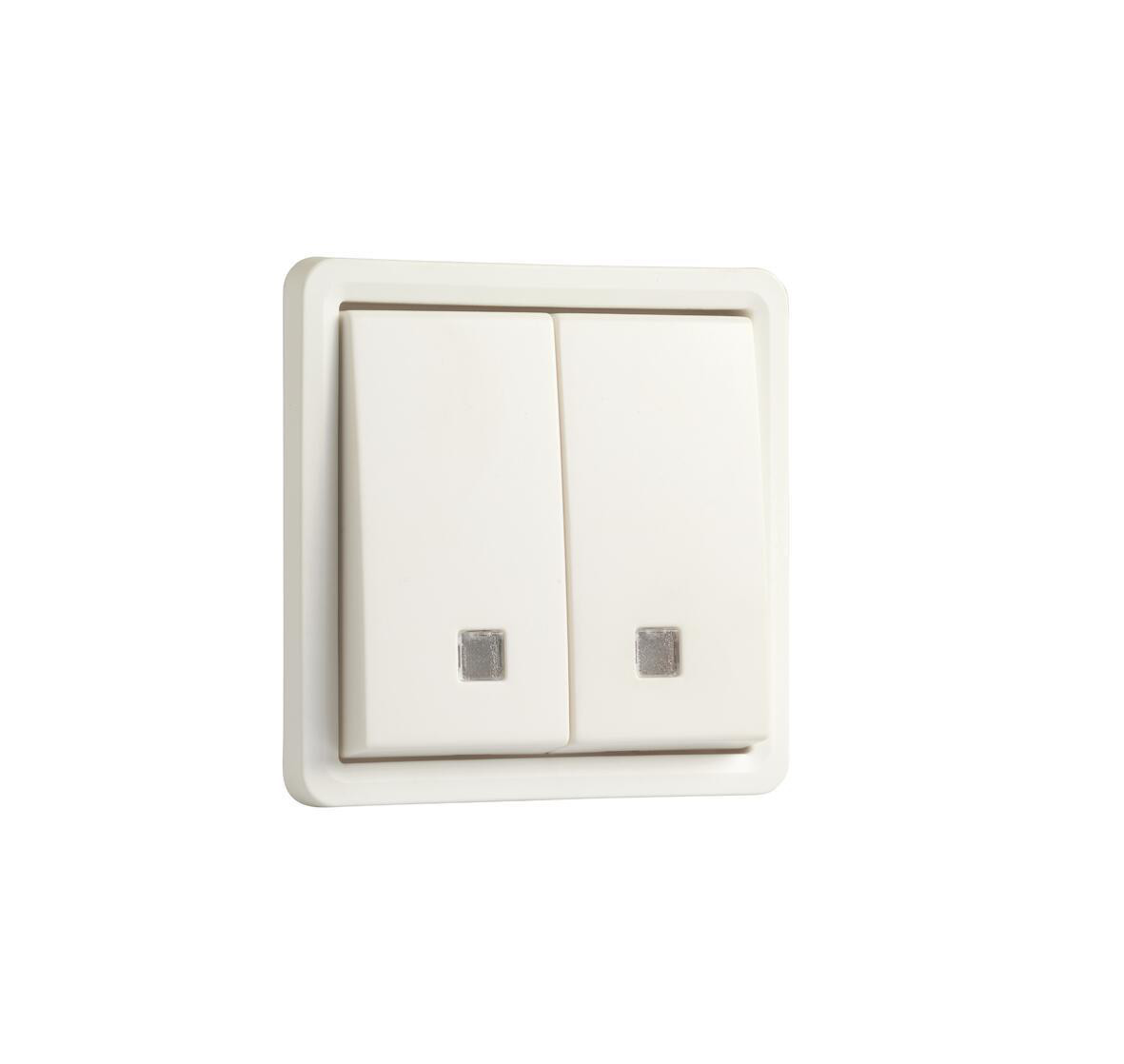 Stænktæt dobbelt fjedertryk fra Niko med N.O./N.C., 10A/250 Vac, linse til LED-element og plug-in-klemmer. IP55 klassificeret og slagfast.