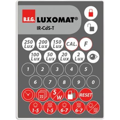 Infrarød fjernbetjening til nem indstilling af parametre. Leveres med vægbeslag til CdS-T-P skumringsrelæ og AL5-RC-Plus Next.