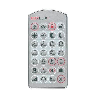 Esylux fjernbetjening til bevægelsessensor med automatisk indlæsning af lysværdi og programmerbar efterløbstid. Inkl. vægholder.