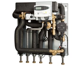 Komplet og monteringsklar fjernvarmeunit til direkte forsyning med indbygget blandekreds til varmeanlæg og varmt vand. Tilpasset Vejle/Mølholm. Overholder DS452/DS469.