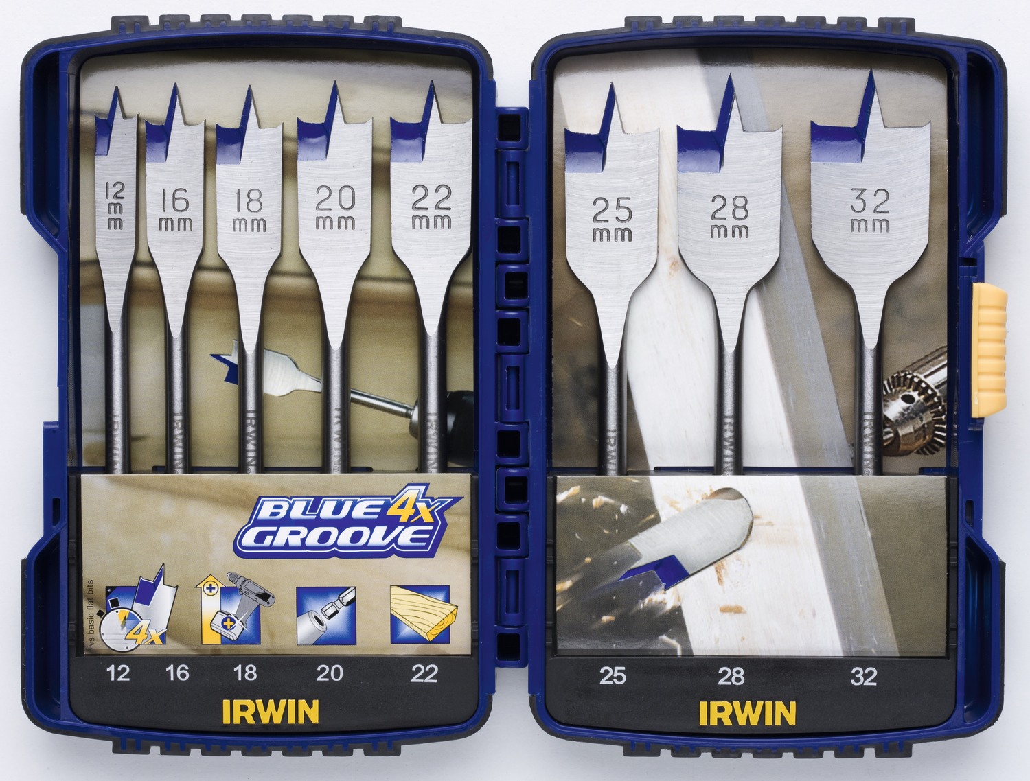 Irwin Blue Groove 4X fladborsæt er et sæt med otte fladbor i størrelserne 12, 16, 18, 20, 22, 25, 28 og 32 mm. Fladborene er designet til at bore hurtigere og mere effektivt i træ.