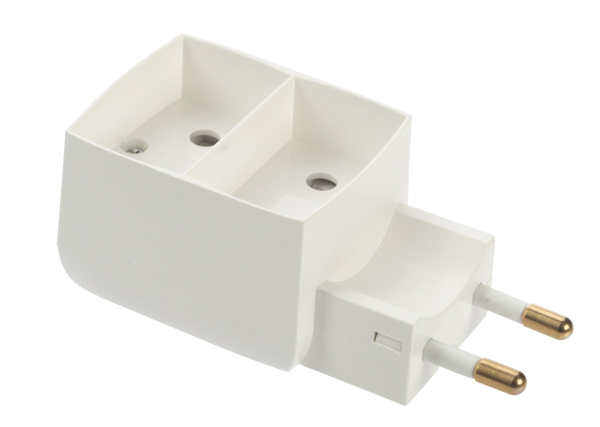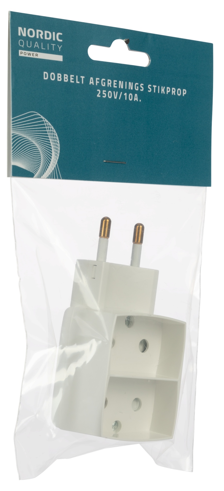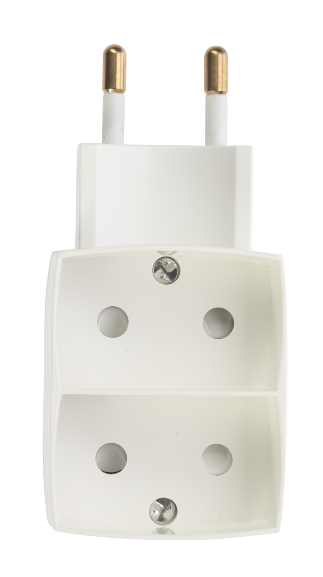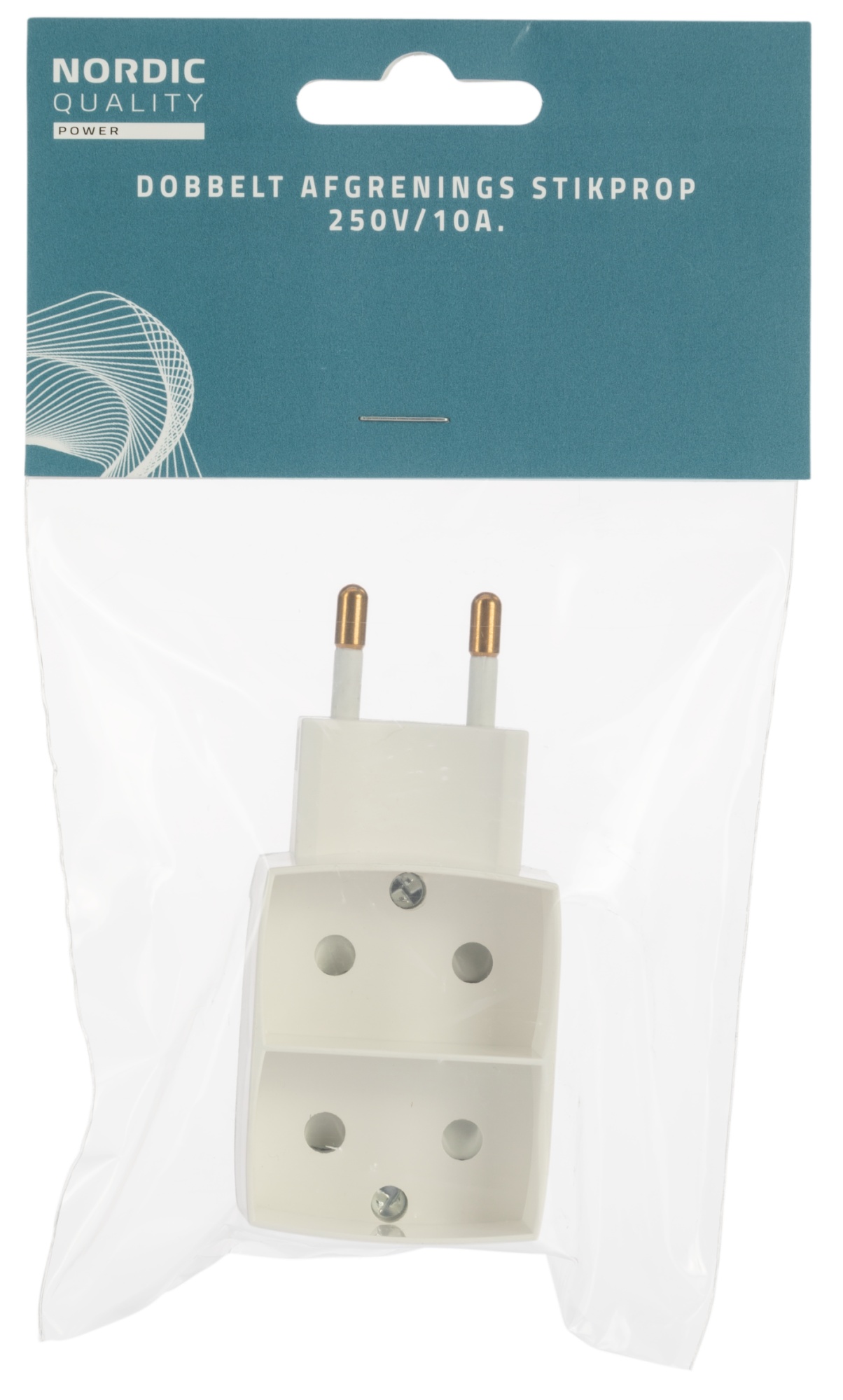 Fladt 2-vejs distributionsstik, der gør det muligt at tilslutte 2 enheder sikkert til en elektrisk udgang.